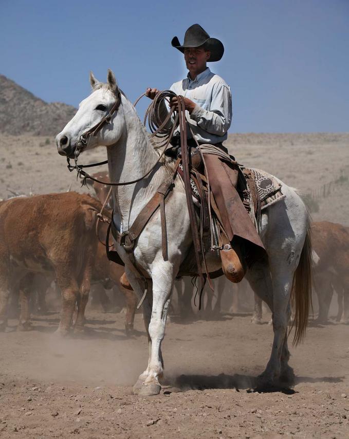 Next the Nevada buckaroo, these cowboys will have a saddle with a Wade tree in it. Mmost of the time they will also always carry a rope on the saddle. But the way that it is attached to the saddle is different from the Arizona cowboy. They will tie their rope on with a narrow leather strap and their rope will be usually over 40 feet long and some times up to 60 or 70 feet long. The horn on their saddle is usually warped with mule hide to allow them to be easier on the calf. When they rope them they can slide more rope and make their horse pull on the cattle less. In Nevada the chaps that they wear are made out of a much lighter leather and are shorter. There isn't as much protection on their lower leg. This is because where they work there is not as much brush.